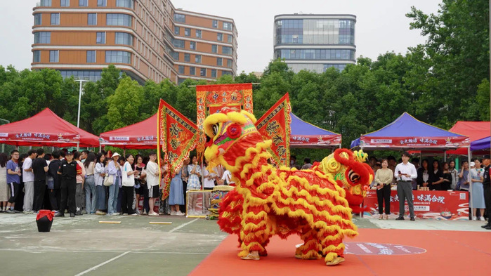 美食节不仅有美食,活动也不能少。在“校园文化与安徽美食”互动有奖问答环节中,在场观众积极参与,现场气氛热烈。在文艺演出环节中,伴随着一声声铿锵有力的锣鼓声,国潮舞狮秀拉开帷幕,狮子时而腾空飞跃,时而俯身前行,高难度动作引来观众的热烈掌声和欢呼声。啦啦操队员们踏着动感的鼓点,跃动着轻盈的脚步,身姿律动、动作优美,自信的笑容感染着在场的每一位观众。合唱团悠扬动听的歌声吸引同学们纷纷驻足欣赏,音乐和美食共舞,将活动推向了高潮。