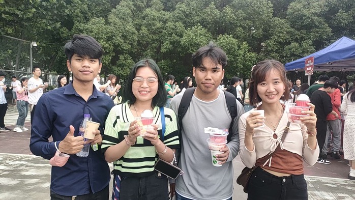 脆皮乳鸽皇,椒盐排骨,香酥鸡中翅,避风塘烤排,水煮牛柳,特色烧龙虾……一排排整齐的美食车摆满了色香味俱全的各类菜肴,校内各家餐饮公司纷纷拿出自家绝活,各色美食精彩呈现,广场上食物飘香,让人垂涎欲滴。师生们三五成群,在各个美食摊点前驻足流连,排队品尝丰盛美味的食物。现场人头攒动,每个人脸上都洋溢着快乐的笑容。